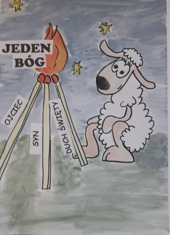 Na obrazkach wykonanych przez Panią Sylwię widzimy Trójcę, i ją omawiamy. Pierwsza Osoba Boska nazwana jest Bogiem Ojcem. Chrystus poproszony o nauczenie nas modlitwy polecił: „Wy zatem tak się módlcie: Ojcze nasz, który jesteś w niebie”. Bóg jest zatem naszym ojcem, ojcem każdego z nas, ojcem wszystkich ludów i narodów. Ten Ojciec na początku stworzył niebo i ziemią. Co wynika z tego, że Bóg jest Stworzycielem? To, iż każdy z nas zawdzięcza swoje stworzenie, swoje istnienie Bogu. Bóg zadecydował o fakcie naszego życia. Dodajmy jeszcze, iż jest nam także objawione, że nasz Bóg Stworzyciel darzy nas przeogromną, nieustającą miłością. Druga Osoba Trójcy Świętej jest nam jakby najbliższa, gdyż to Ona stała się człowiekiem. „Słowo stało się ciałem i zamieszkało wśród nas” – czytamy w Ewangelii Janowej. Zaś w Wyznaniu Wiary mówimy słowa: „On to dla nas ludzi i dla naszego zbawienia zstąpił z nieba i za sprawą Ducha Świętego przyjął ciało z Maryi Dziewicy i stał się człowiekiem”. Powyższe słowa tłumaczą powód przyjścia Chrystusa na ziemię, powód wcielenia Syna Bożego. Zatem Chrystus nie tylko przyniósł nam prawdę na ziemię, nie tylko objawił nam, kim jest Bóg, kim jest człowiek, jakie zamiary ma Bóg względem człowieka. Główne dzieło Chrystusa wobec świata, a w szczególności wobec człowieka, to zbawienie, odkupienie dokonane przez śmierć krzyżową i chwalebne zmartwychwstanie. Trzeciej Osobie Boskiej, Duchowi Świętemu, przypisujemy dzieło uświęcania świata. Osoba Ducha Świętego była już po części objawiana w Starym Testamencie. Trójca Święta jako doskonała wspólnota Osób Boskich jest dla nas wzorem tworzenia jedności, wspólnoty z drugimi. Bóg nie jest samotnikiem. Jest wspólnotą osób. Człowiek też nie może być samotnikiem. Misiu, w tym tygodniu, przygotowując do Technikum okolicznościową katechezę online o Trójcy Świętej, wysłałem uczniom takie oto świadectwo. Posłuchaj: Był piękny majowy dzień. Zapowiadał się kolejny udany czas dla 25-letniego Marka. Jechał do swojej narzeczonej Marysi, która czekała na niego, bowiem wspólnie mieli rozwozić zaproszenia na ślub. Jak zwykle podjechał do niej pod sam dom. Tak jak zawsze przywitał się z przyszłą teściową, która go wprost uwielbiała. Szybko z narzeczoną wyszli z domu, bo zaproszeń było jeszcze sporo. Wszędzie, gdzie jechali, byli przyjmowani serdecznie. Ileż razy usłyszeli, że są zgraną parą. Ostatnie zaproszenie dostarczyli około 21.00. Zmęczeni, ale szczęśliwi wracali do domu. Zmieniła się jednak pogoda, zaczęła się typowa wiosenna burza! Samochód wpadł w poślizg i wylądował na drzewie. Ona cudem wyszła z wypadku cała i zdrowa. On leżał nieprzytomny. Marysia wpadła w panikę. Jedyne, co przyszło jej do głowy, to przeżegnanie się. Nie potrafiła się nawet modlić. Po uczynieniu znaku krzyża nadludzkim wręcz wysiłkiem odrzuciła pień drzewa, wyciągnęła swego ukochanego z samochodu i w ten sposób go uratowała. Później wszyscy dziwili się, jak mogła podnieść tak ciężki kawał drzewa. Marysia ma jednak swój pogląd na tę sprawę: „Znak krzyża sprawił, że uwierzyłam w swoje siły!”. Czerwiec sprzyja decyzjom zawarcia związków małżeńskich. I mimo pandemii znów ludzie wierzący chcą ślubować przed Bogiem miłość, wierność i uczciwość małżeńską. Myślę, że dla młodych ludzi, którzy w technikum, w klasach trzecich, myślą o swojej przyszłości poważnie i założą rodziny, ten przykład jedności i wiary przyda się bardzo. Bo związek mężczyzny i kobiety, jeżeli jest trwały, oparty na miłości – tak jak relacje pomiędzy osobami Trójcy Świętej, może przetrwać wszystko. Ale co nam powie dziś owieczka Magda? Co ona zapisała pod datą 7 czerwca? „Są takie tajemnice na świecie, których nikt nie zrozumie. Wielu uczonych, badaczy, odkrywców próbuje znaleźć odpowiedź na nurtujące ich pytania. Pamiętam, jak ksiądz wikariusz Mariusz opowiedział nam taką historię o pewnym świętym. Miał na imię Augustyn i żył bardzo dawno temu. W młodości zupełnie nie wierzył w Pana Boga, ale jego mama, która też została świętą, ciągle się za niego modliła i na pewno dzięki temu pokochał Pana Jezusa. Później został księdzem, a nawet biskupem i największym uczonym Kościoła. Kiedyś chciał zbadać i zrozumieć jedną tajemnicę. Poświęcał wiele czasu, żeby zbadać jak to jest, że jest jeden Bóg, ale w trzech osobach: Ojciec, Syn i Duch Święty. Poświęcał na to wiele czasu. Bez końca wertował księgi, rozmawiał z innymi. Pewnego dnia, jak przechadzał się brzegiem morza, zauważył małego chłopca, który miał wykopany w piasku dołek i muszelką przenosił wodę z morza do dołka. Augustyn zaciekawiony zapytał go, co robi. Ten mu odpowiedział, że przelewa morze do dołka. Augustyn stwierdził, że mu się to nigdy nie uda. Na co chłopiec spojrzał na niego i powiedział, że prędzej przeleje wodę do dołka niż Augustyn pozna tajemnicę Trójcy”. Codziennie wypowiadamy tę modlitwę, Mszę Świętą zaczynamy tym znakiem, przyjmujemy błogosławieństwo w tym imieniu – Trójcy Świętej. Jest to trudne zagadnienie. Przygotowując obrazki, pani Sylwia musiała się sporo nagłówkować, jak przedstawić Trójcę Świętą. (Ale jak przedszkolanka nie poradzi sobie). Owieczka Magda wspominała opowiadanie o przelewaniu morza do dołka. Wiele czasu byśmy potrzebowali, żeby przelać wodę małą muszelką z jednego pojemnika do drugiego. Jeśli mówimy o Trójcy, to nazywamy jej Osoby – Ojciec, Syn i Duch Święty. Każda osoba jest tak samo ważna. Dobrze to przedstawia owieczka Magda na obrazku z zapałką – kiedy myślimy o Trójcy, to jakbyśmy połączyli trzy zapałki w jednym płomieniu. Łatwiej nam się modlić, kiedy wiemy, że Bóg jest jed
