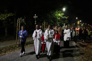 Przemierzając pogrążone w wieczornym mroku ulice Szczawna-Zdroju modliliśmy się o pokój na świecie, a szczególnie w pogrążonej w wojnie Ukrainie. Kobiety, mężczyźni i służba liturgiczna nieśli figurkę Matki Bożej, a drogę oświetlała im niosąca pochodnie młodzież. Licznie zgormadzeni wierni – mieszkańcy naszego miasta oraz kuracjusze – kolejny raz dali świadectwo swojej wiary wychodząc wraz ze swoimi kapłanami w przestrzeń publiczną miasta.